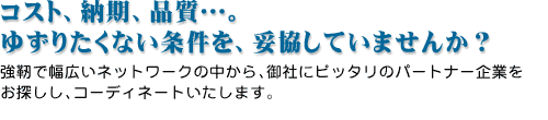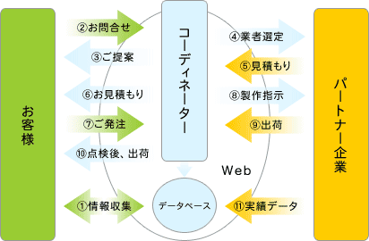 と呼ばれるプロフェッショナルがいます。そのコーディネーターが御社にピッタリのパートナー企業をコーディネートし、アフターまで責任を持ってお手伝いいたします。